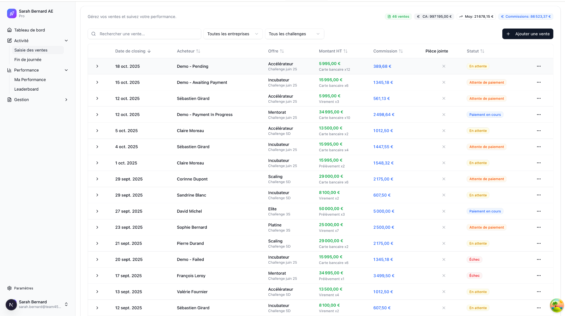 Accédez instantanément à tous vos KPIs : ventes, CA, commissions et taux de conversion. Suivez l'évolution en temps réel.